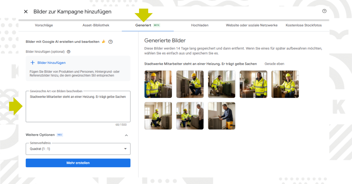Google schränkt bestimmte Inhalte automatisch ein – wie etwa Kinder und bekannte Personen, Markenartikel und Logos, die nicht als Eingabe vorgegeben wurden. Außerdem weist Google ausdrücklich darauf hin, dass KI-generierte Assets nicht automatisch richtlinienkonform sind: Werbetreibende müssen die Ergebnisse vor Veröffentlichung selbst prüfen, damit sie korrekt, nicht irreführend und rechtlich sowie policy-seitig zulässig sind.