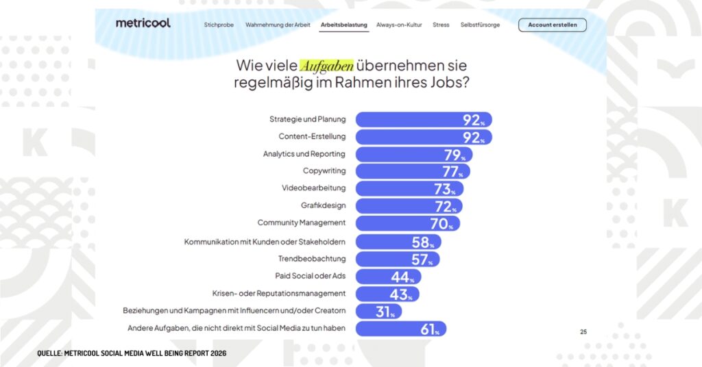Während Außenstehende oft nur den fertigen Post sehen, bewältigen Profis im Hintergrund ein gewaltiges Pensum. Wer im Social Media-Bereich arbeitet, übernimmt heute im Schnitt über zehn verschiedene Rollen gleichzeitig – von der Strategieplanung (92 %) über tiefgehende Analysen und Reportings (79 %) bis hin zum Krisenmanagement (43 %).
