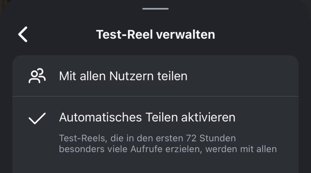 Auch das Automatische Teilen mit der Community nach 72h (vorausgesetzt das Reel performt gut) kann aktiviert oder deaktiviert werden. (siehe Bild)