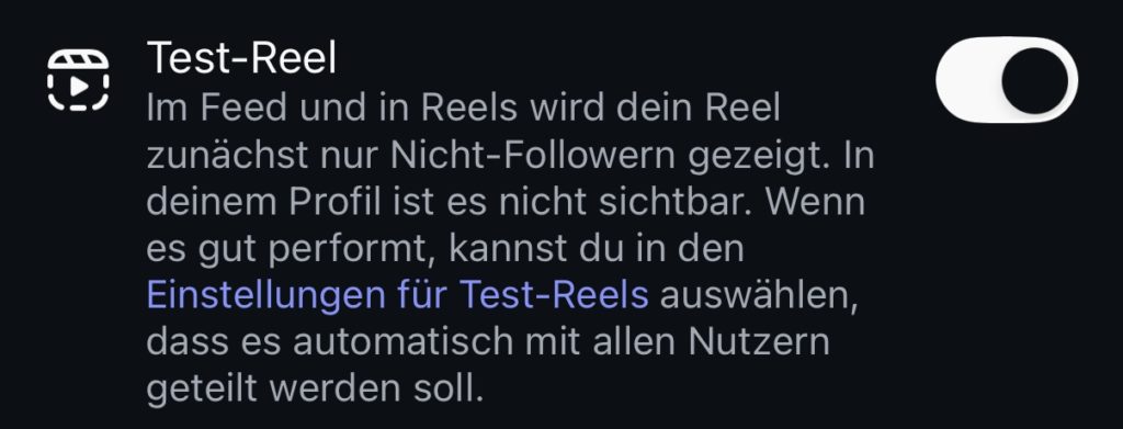 Um ein reguläres Reel zum Test-Reel zu verwandeln, müsst ihr im Upload-Prozess auf Instagram lediglich einen kleinen Schieber betätigen (siehe Bild ).